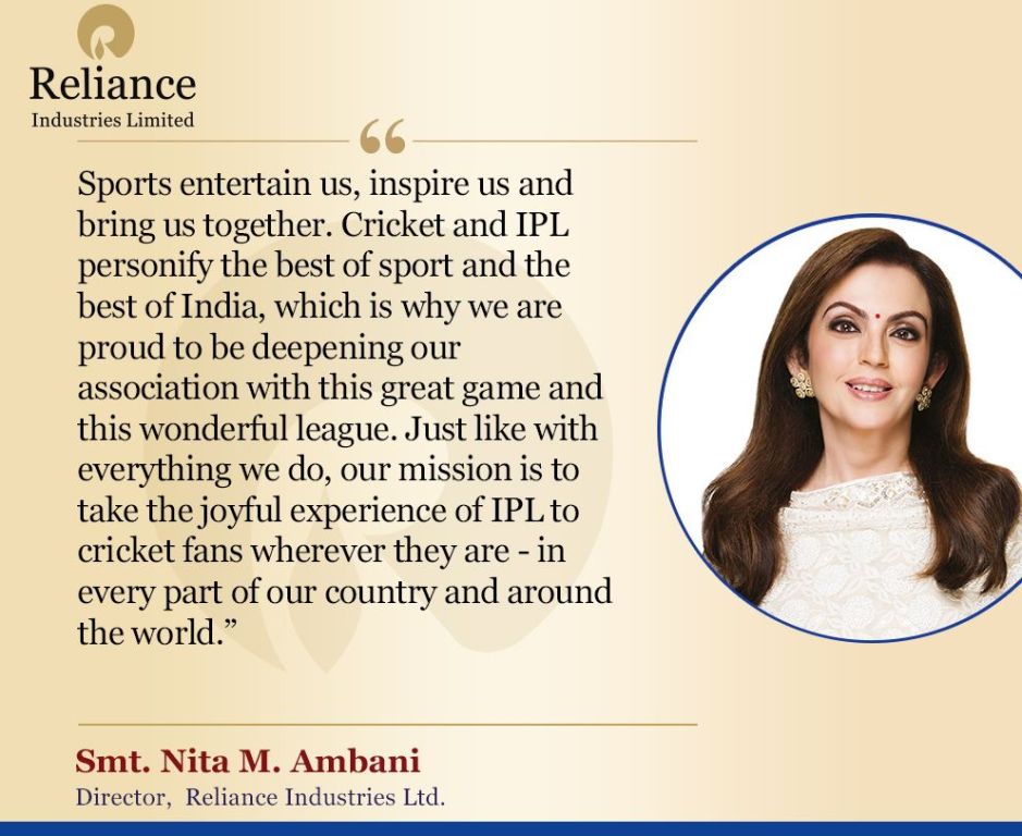 “Sports entertain us, inspire us and bring us together. Cricket and IPL personify the best of sport and the best of India, which is why we are proud to be deepening our association with this great game and this wonderful league. Just like with everything we do, our mission is to take the joyful experience of IPL to cricket fans wherever they are - in every part of our country and around the world” said Nita Ambani, Director, Reliance Industries Ltd.